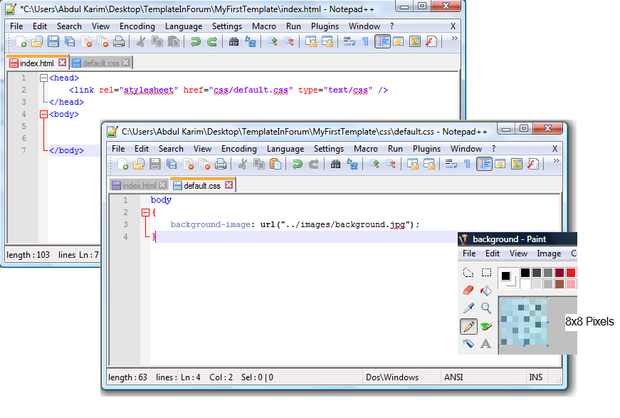 Also, shown in this picture is "background.jpg" and 8x8 pixel image to be used as a background of the of our web page.